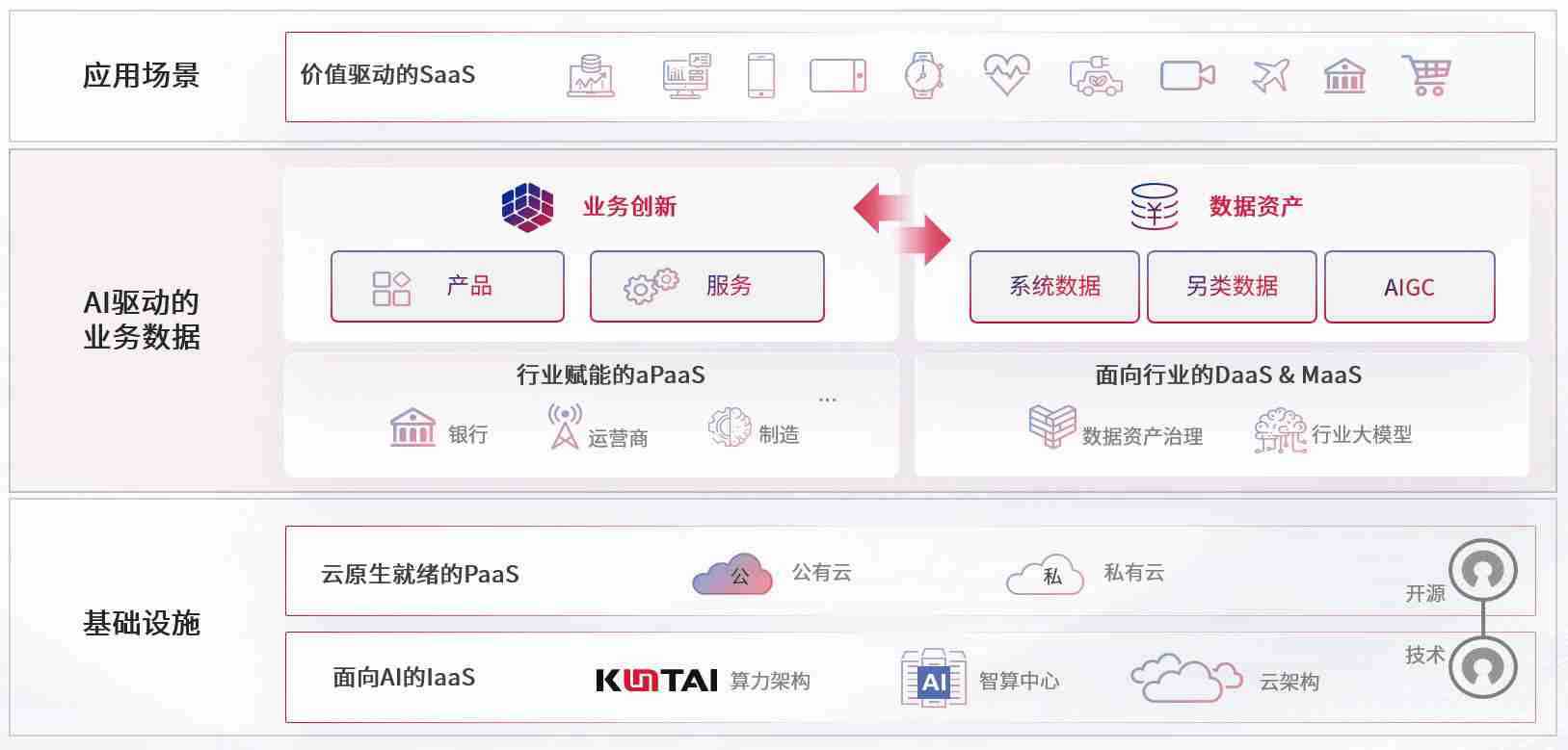 数字时代,,围绕企业数字化转型的关键要素,,,Z6尊龙数码开创性的提出数云融合战略和技术体系框架,,着力在云原生、、、、数字原生、、、AI原生和信创产业上架构产品和服务能力,,,,为处在不同数字化转型阶段的快消零售、、、汽车、、、金融、、、医疗、、、政企、、教育、、、运营商等行业客户提供泛在的敏捷IT能力和融合的数据驱动能力,,,构建跨界融合创新的数字业务场景和新业务模式,,,,助力企业级客户建立面向未来的核心能力和竞争优势,,,全面推动社会的数字化、、智能化转型升级。。。。